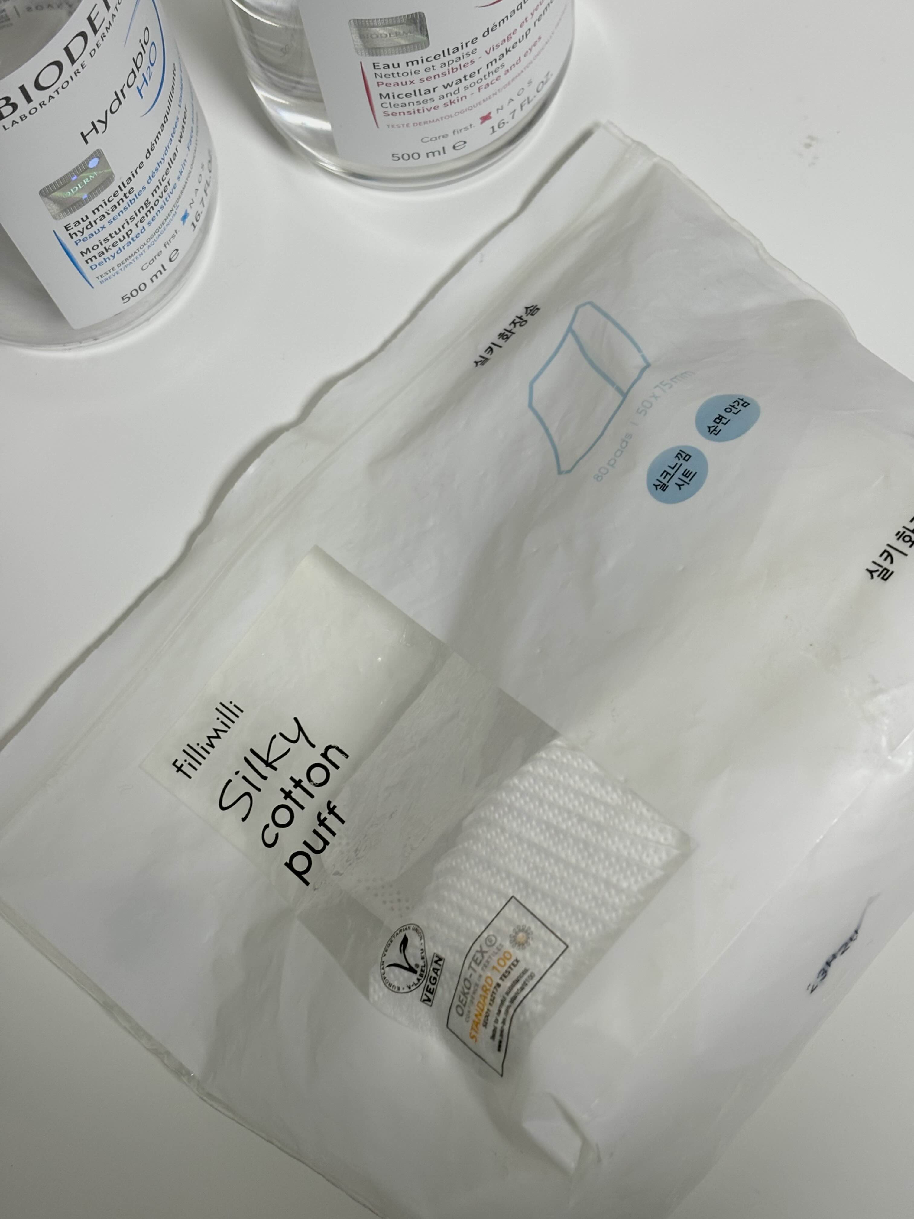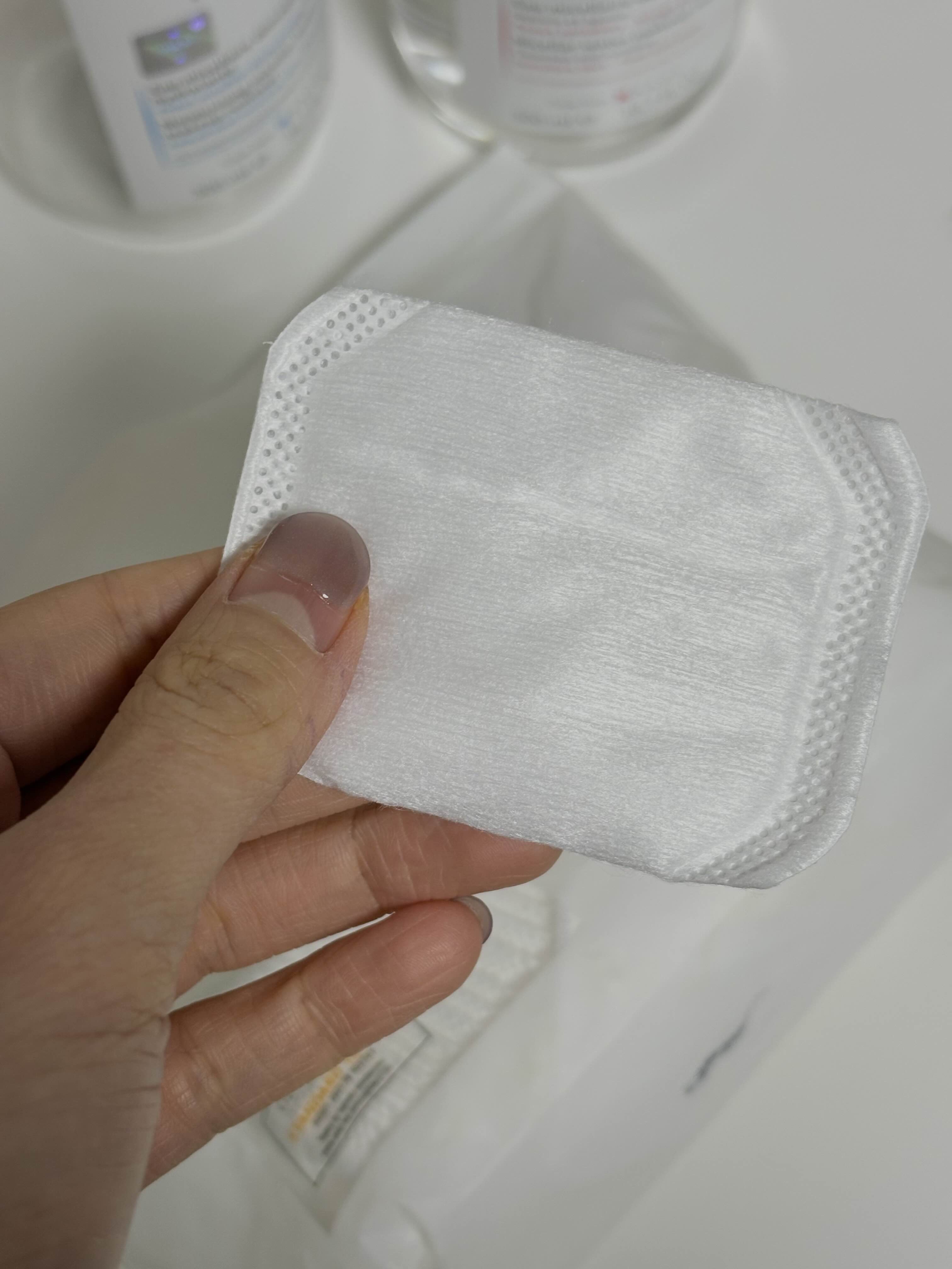 아솜은 사실 순면이고 큰 사이즈로 좋지만 얇은 편이라 여행 시에 쓰려고 두었고요. 바이오더마 클렌징 워터를 사용하시는 분들에 꿀조합으로 가장 많이 쓰는 화장솜을 바로 소개해드리겠습니다.