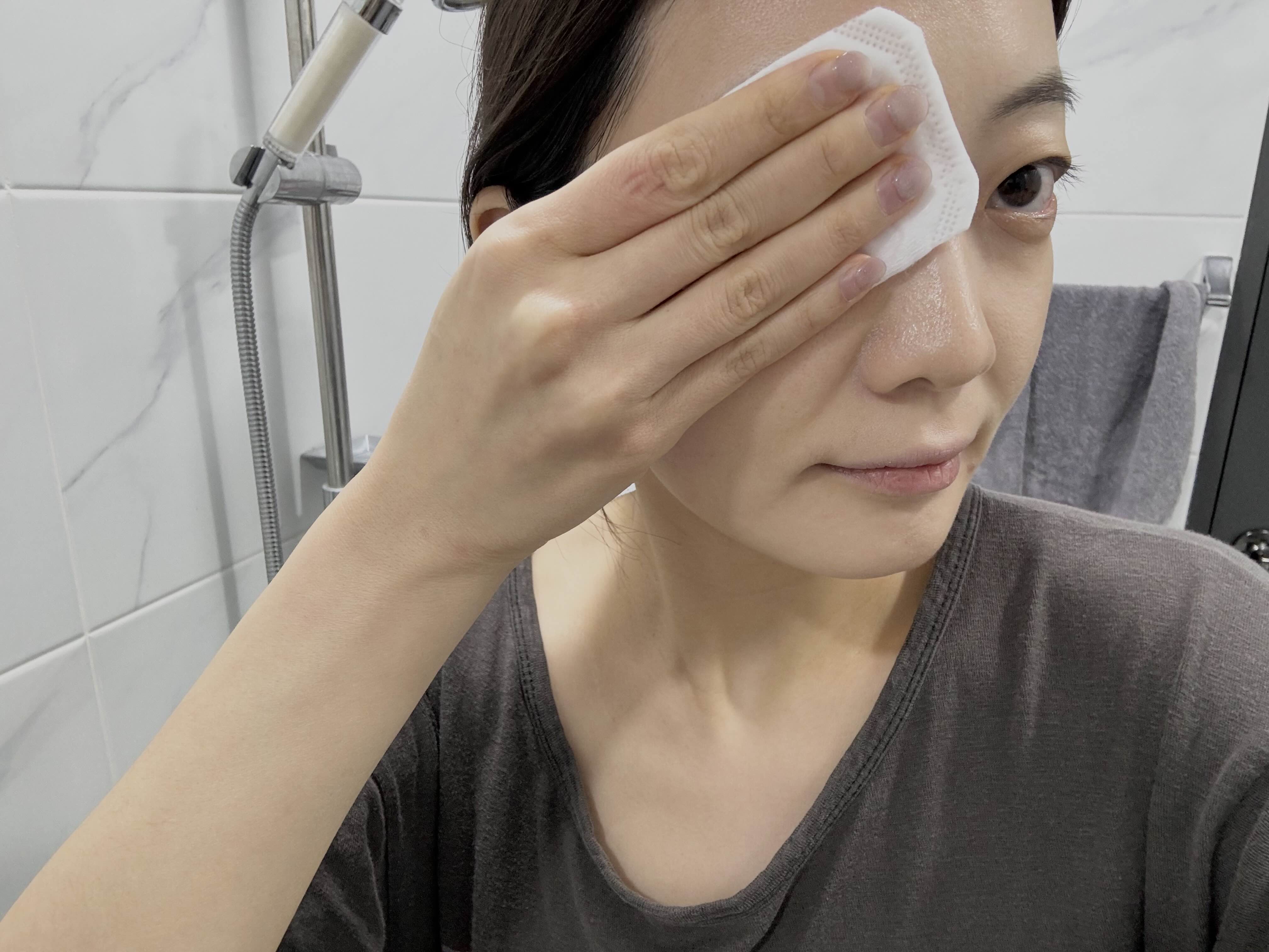 눈 주변도 살짝 얹어주었다가 재빠르게 슥슥 닦아냅니다.