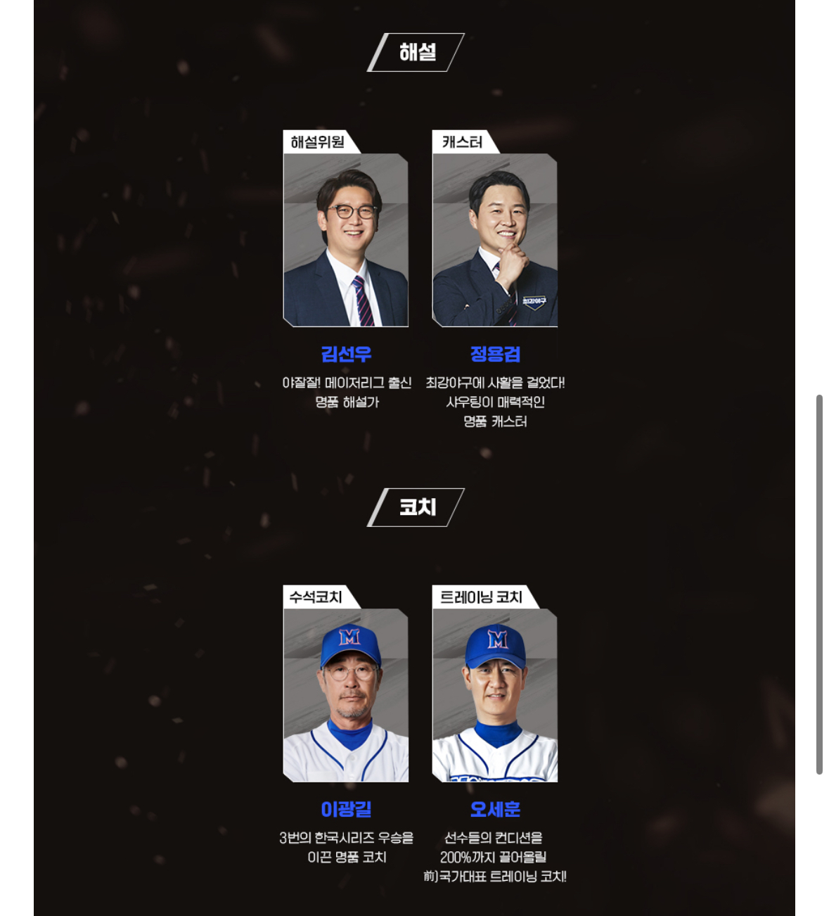 제일 재밌는 최강야구 해설진. 늘 감동과 재미있는 솔직한 해설로 늘 제게 행복을 주었던 김선우 해설위원과 정용검 캐스터. 이번 시즌 어떤 즐거움을 줄지 기대되는데요. 시즌 확정되자마자 눈물을 흘렸던 해설진의 모습이 인상깊었어서 계속 기억이 납니다.