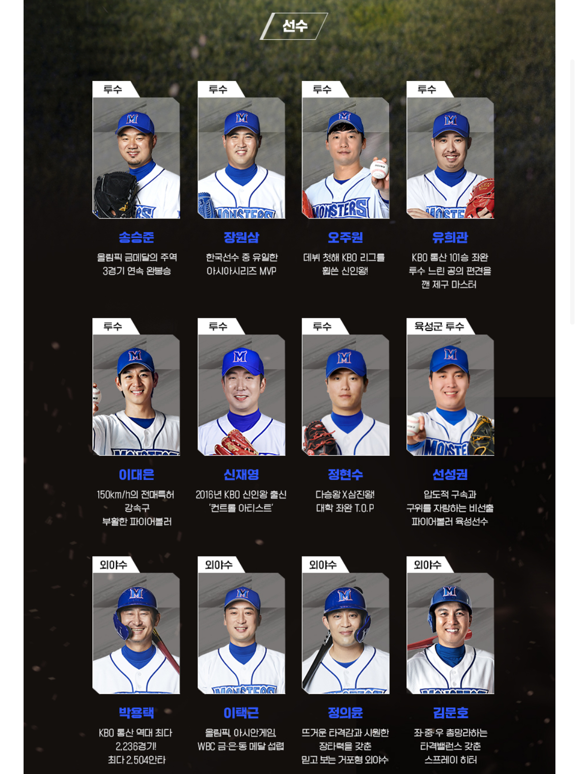특히 출전을 많이 못했던 송승준, 장원삼, 유희관 선수들의 활약과 플레이도 기대해보고 싶습니다. 프로로 떠난 정현수 선수도 보이네요.