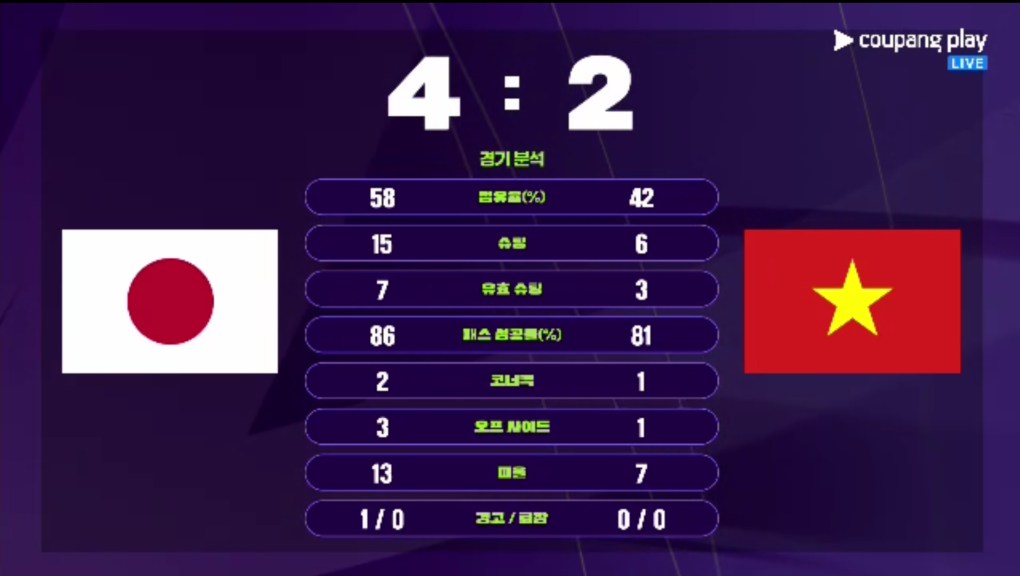 결과적으로 일본이 4-2라는 격차로 승리를 거두었으나, 이 날의 경기는 베트남의 재발견이었습니다. 선수들의 부상이 많고 여러 가지 상황으로 인해 엔트리를 꾸리는 것 자체가 쉽지 않았다는 베트남 축구의 발전 가능성을 볼 수 있던 경기였습니다. 미나미노의 멀티골이 터지면서 일본의 실력을 볼 수 있었으나, 사실상 일본이 완벽하게 주도하는 그들만의 플레이를 편하게 펼치지 못하도록 베트남 대표팀이 나름 잘 상대했다고 봅니다.